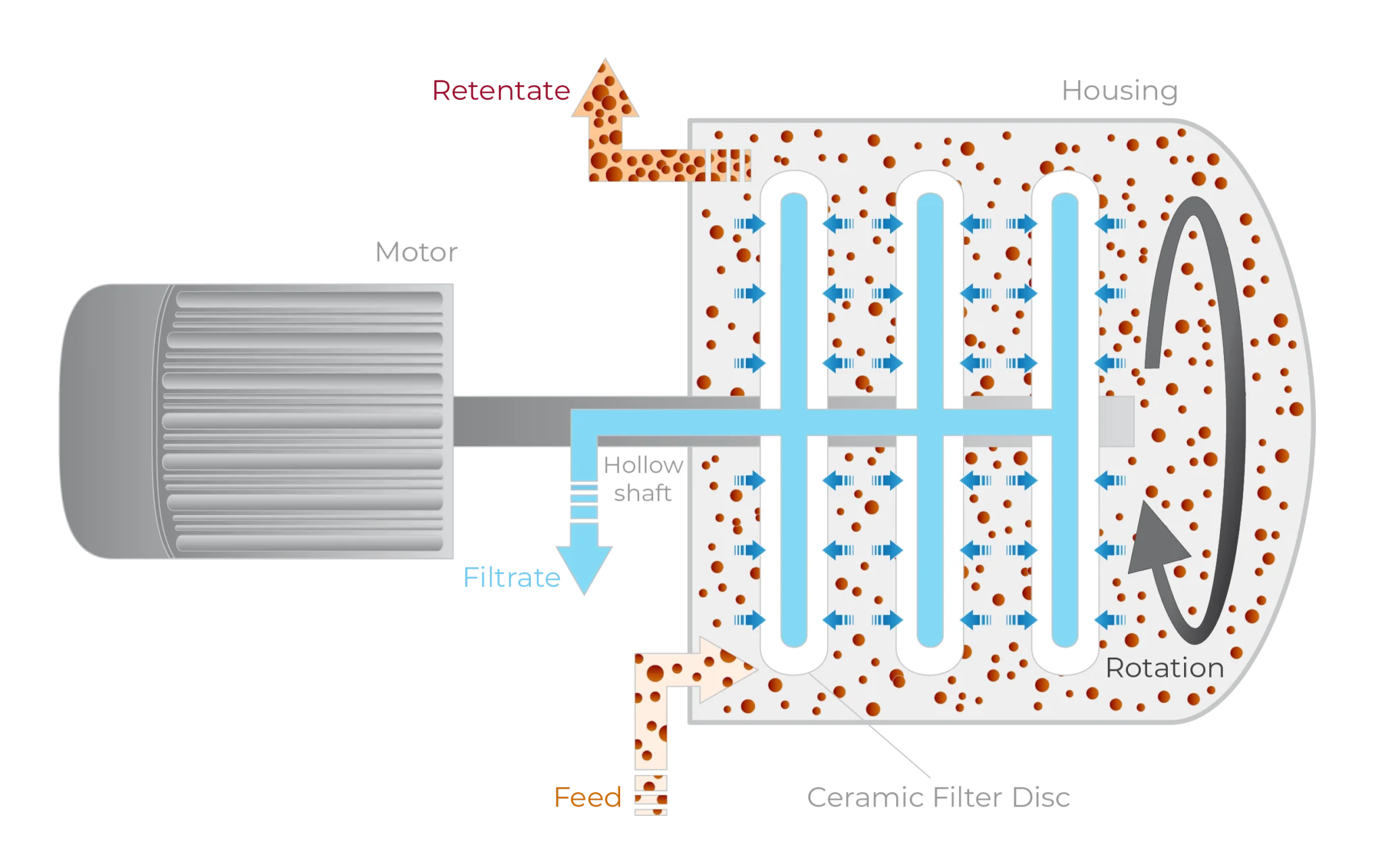 The ceramic filter discs are mounted on one or more hollow shafts that rotate inside a pressure housing.