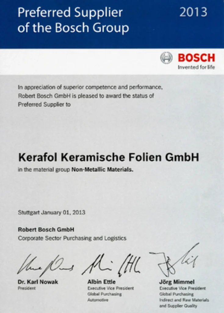 Die Robert Bosch GmbH hat Kerafol – Keramische Folien GmbH als „Preferred Supplier“ im Bereich „Non-Metallic Materials“ der Bosch-Gruppe ausgezeichnet. Im Rahmen des Bosch Preferred-Supplier-Konzepts werden permanent die Lieferanten der Bosch Gruppe bewertet. Je Materialfeld werden anhand festgelegter Kriterien die Lieferanten ausgewählt, mit denen Bosch bevorzugt zusammenarbeiten möchte.